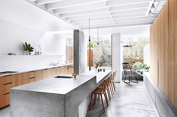در این آشپزخانه درب ها و بدنه کابینت با طرح بتن پوشش داده می شود و می توان بتن را با رنگ ها و متریال مختلف مورد استفاده قرار داد.